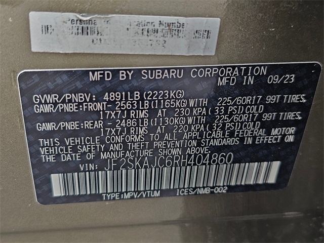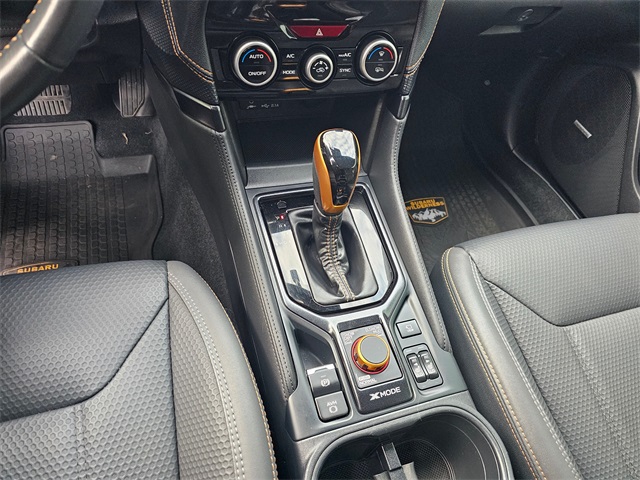 Engine & Performance: 2.5L DOHC Subaru Boxer engine with Auto Start-Stop, Lineartronic CVT with 8-speed manual shift mode and SI-Drive, Symmetrical All-Wheel Drive, X-Mode dual-mode with low speed/low ratio gradient control, 9.2" ground clearance, off-road tuned suspension, 17" matte black alloy wheels, full-size spare, raised roof rails with 800 lb static load capacity, hood graphic, front skid plate, roof spoiler, panoramic moonroof